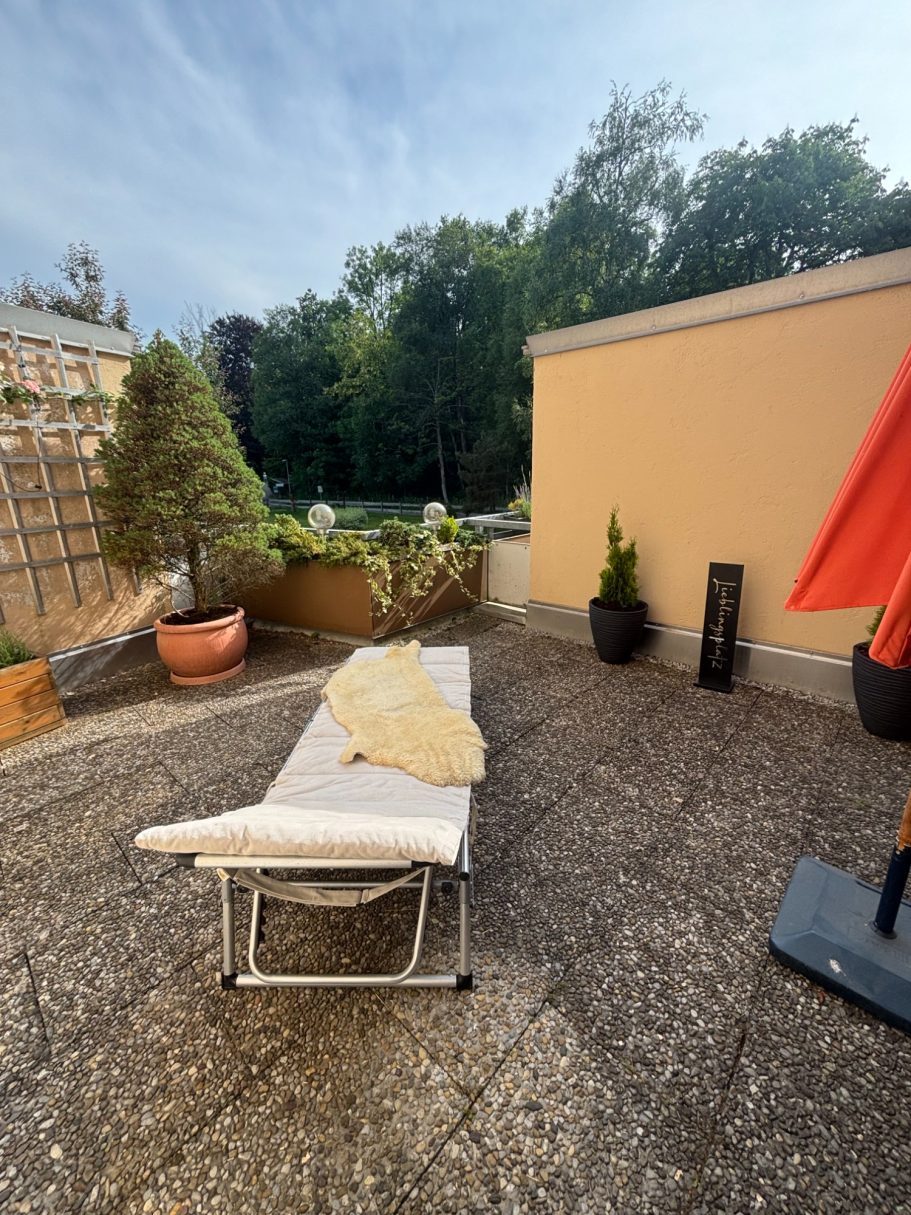 Die große Terrasse lädt zum Verweilen ein. Durch die Überdachung, kann man auch bei etwas regnerischem Wetter draußen sitzen. Hier finden Sie einen großen Tisch, 4 Stühle, eine separate Bank und eine Liege.