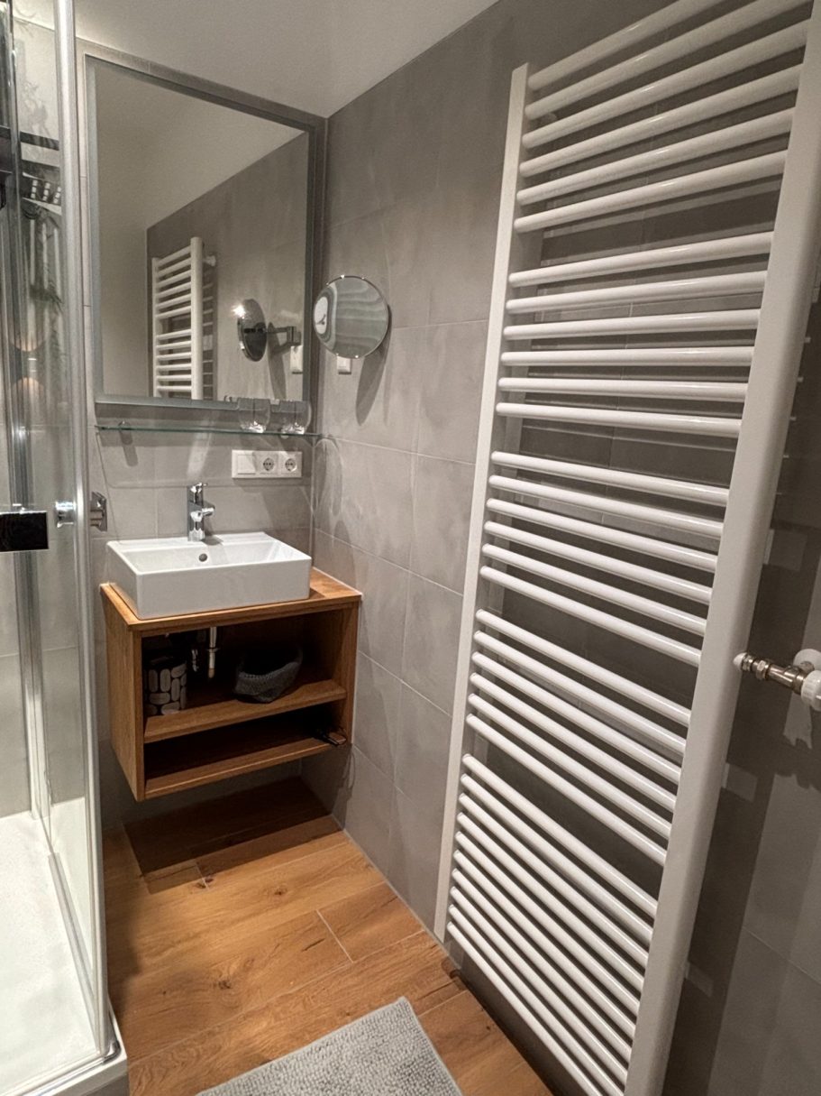 In der Wohnung gibt es ein modernes Duschbad und ein separates WC. Im Bad befindet sich eine 90 x 90 cm große Dusche, ein Waschbecken mit einem Unterbauregal, ein Kosmetikspiegel sowie ein Handtuch-heizkörper.