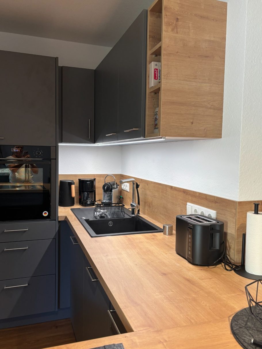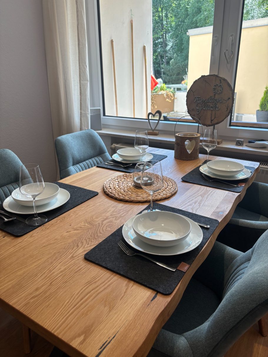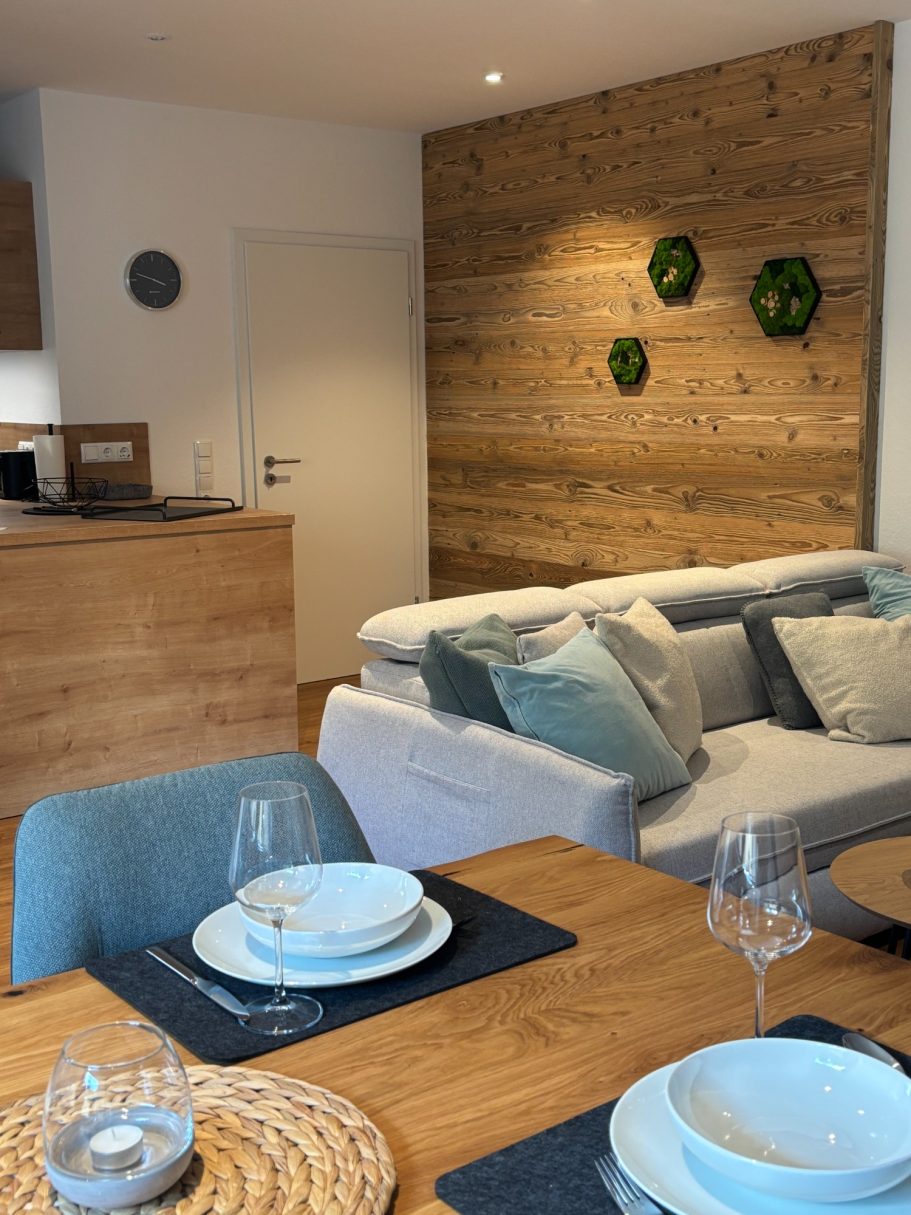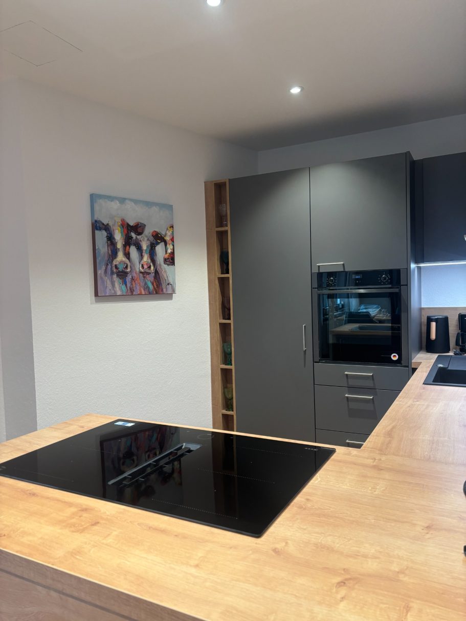 Willkommen in unserem einladenden Wohn-Essbereich! Sobald Sie aus der Garderobe treten, werden Sie von einer warmen Atmosphäre und stilvollem Design empfangen. Hier verbindet sich Gemütlichkeit mit Funktionalität, perfekt für gesellige Abende oder entspannte Stunden.