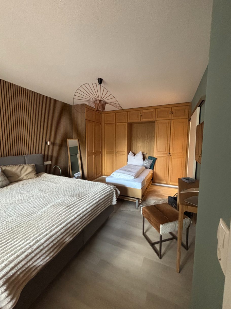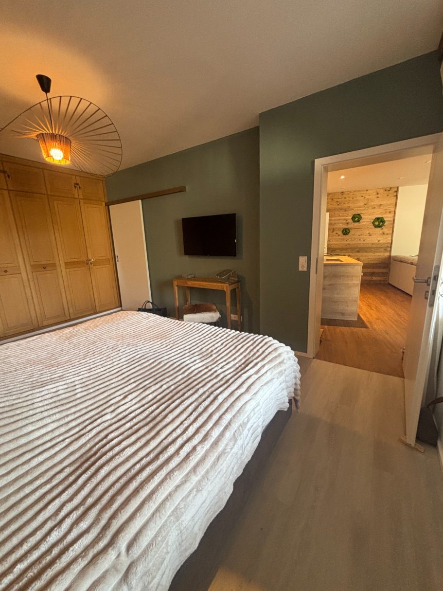 Das großzügige Schlafzimmer ist mit einem Einbauschrank ausgestattet. In diesem Schrank befindet sich ein zusätzliches Schrankbett für eine weitere Person. Das Doppelbett hat eine Größe von 180 x 200 cm. Das Zusatzbett hat eine komfortable Größe von 90 x 200 cm.