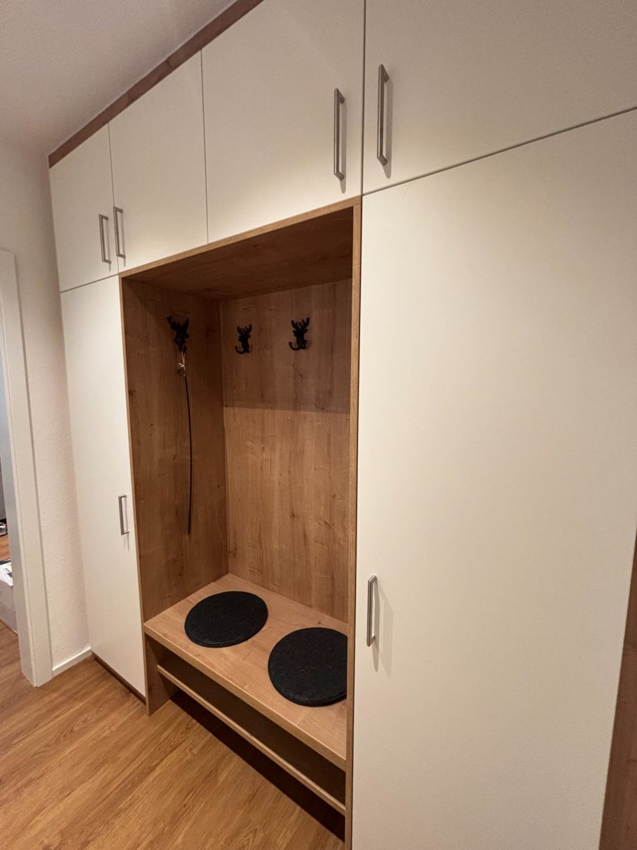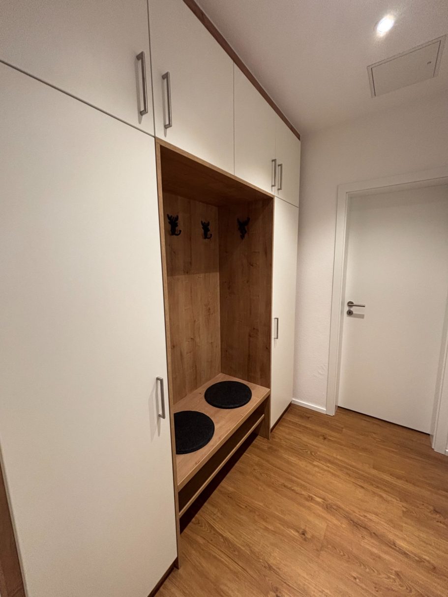 Im Eingangsbereich befindet sich die Garderobe und und der Leinenparkplatz. Hier finden Sie im Schrank auch einen Staubsauger und diverse Reinigungsutensilien