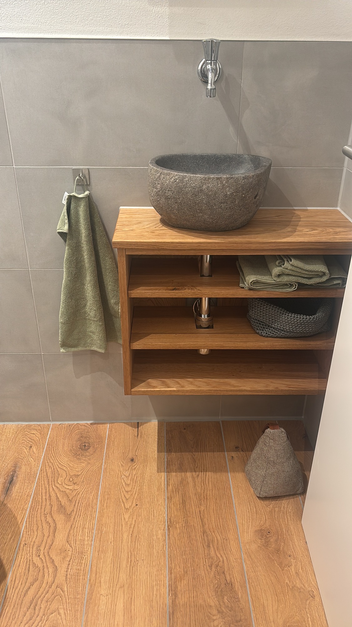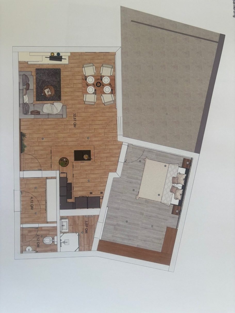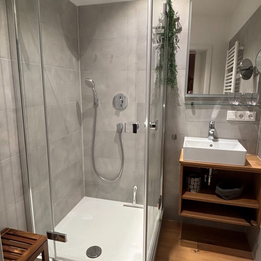 In der Wohnung gibt es ein modernes Duschbad und ein separates WC. Im Bad befindet sich eine 90 x 90 cm große Dusche, ein Waschbecken mit einem Unterbauregal, ein Kosmetikspiegel sowie ein Handtuch-heizkörper.