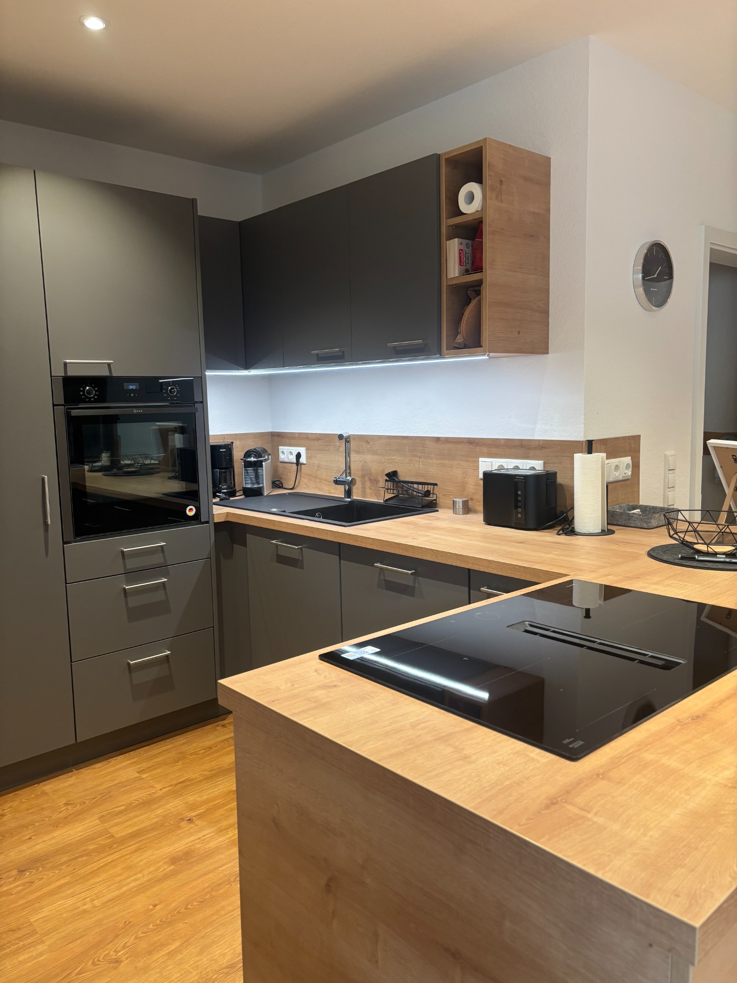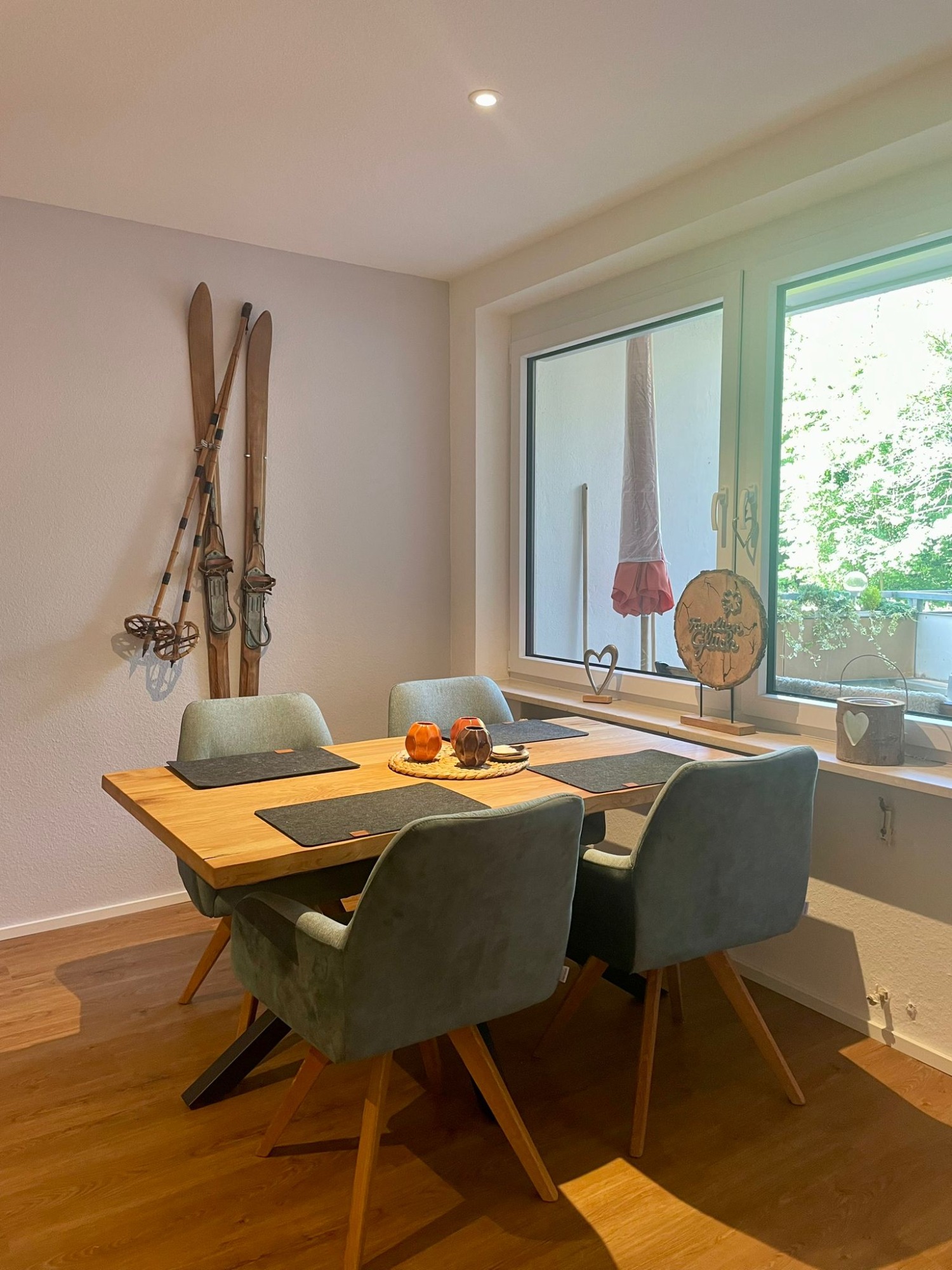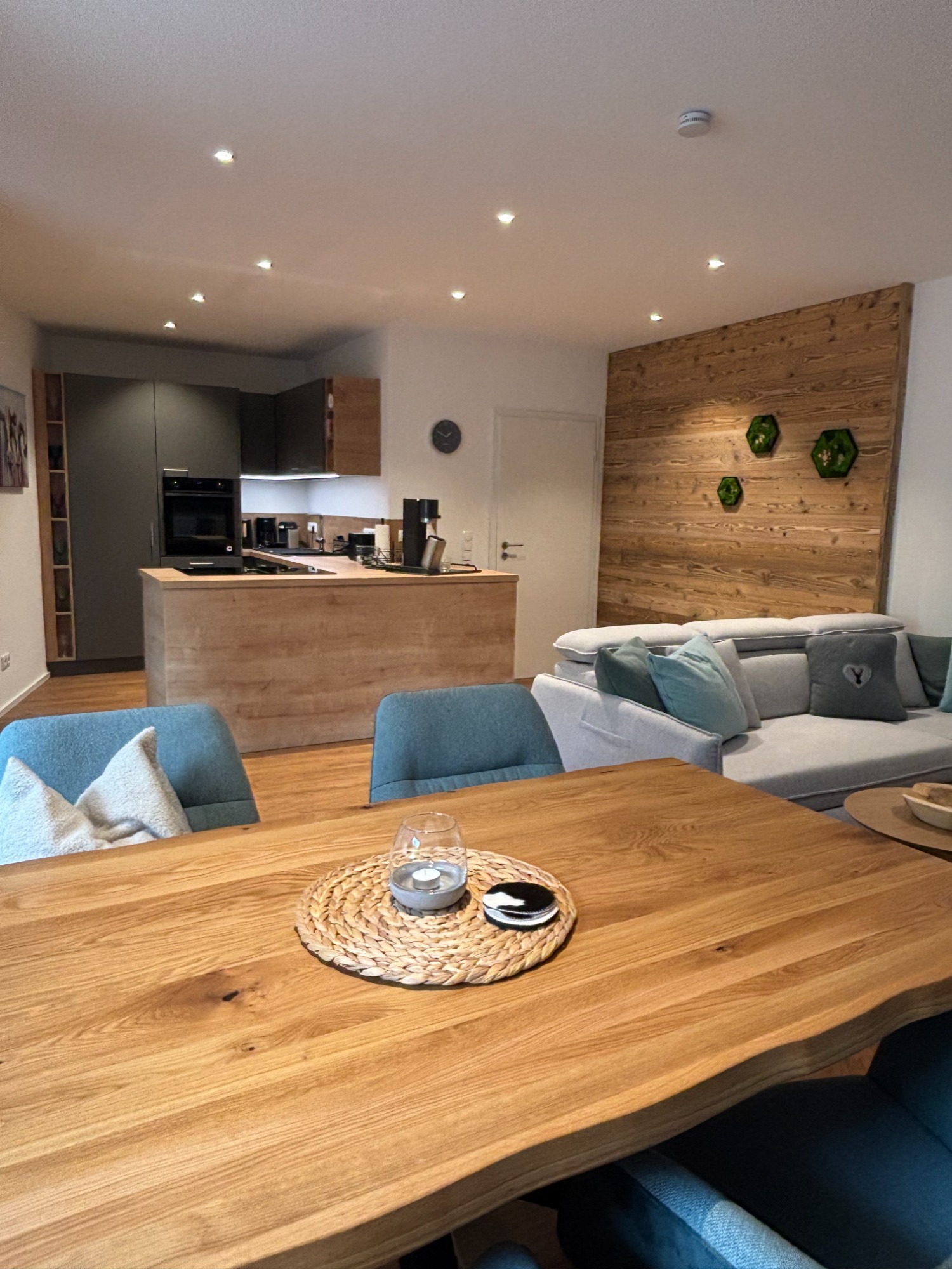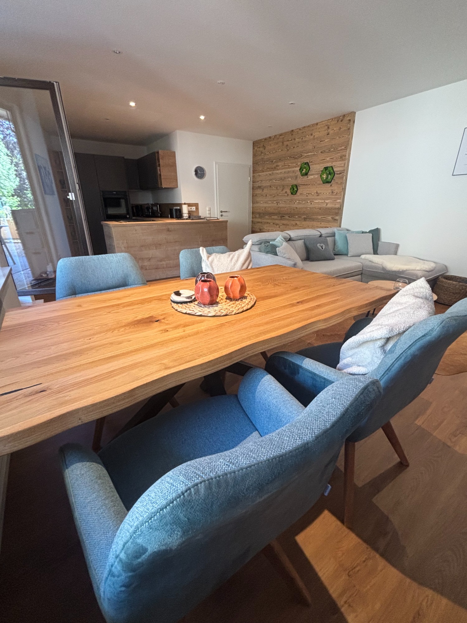 Willkommen in unserem einladenden Wohn-Essbereich! Sobald Sie aus der Garderobe treten, werden Sie von einer warmen Atmosphäre und stilvollem Design empfangen. Hier verbindet sich Gemütlichkeit mit Funktionalität, perfekt für gesellige Abende oder entspannte Stunden.