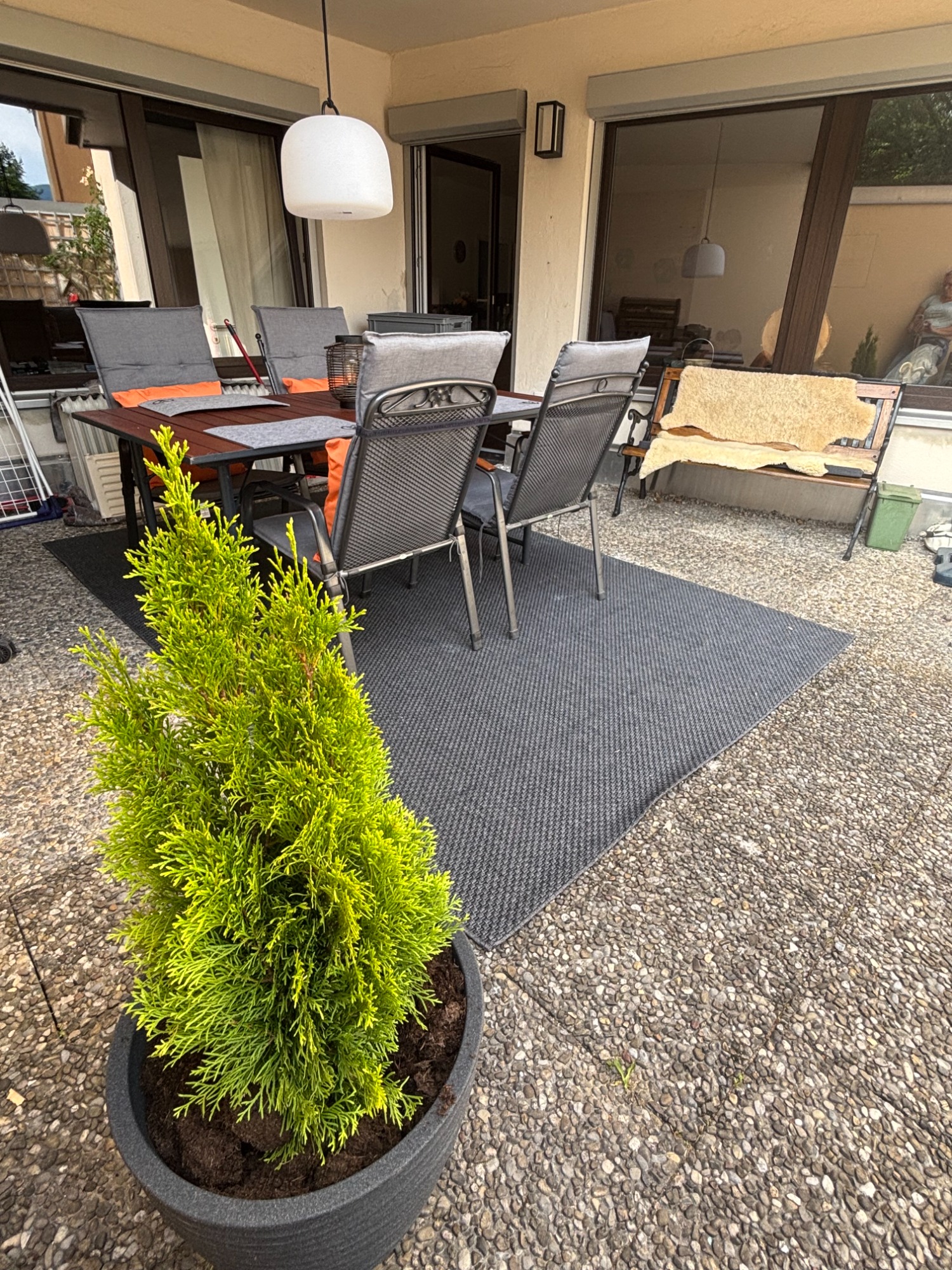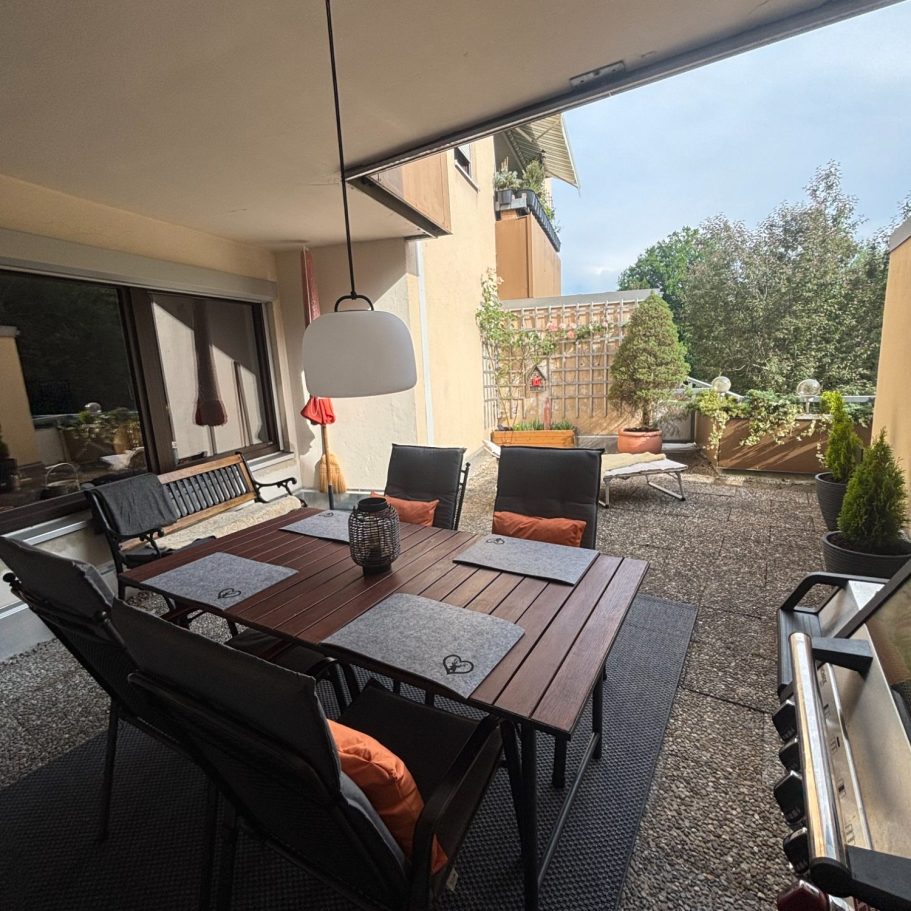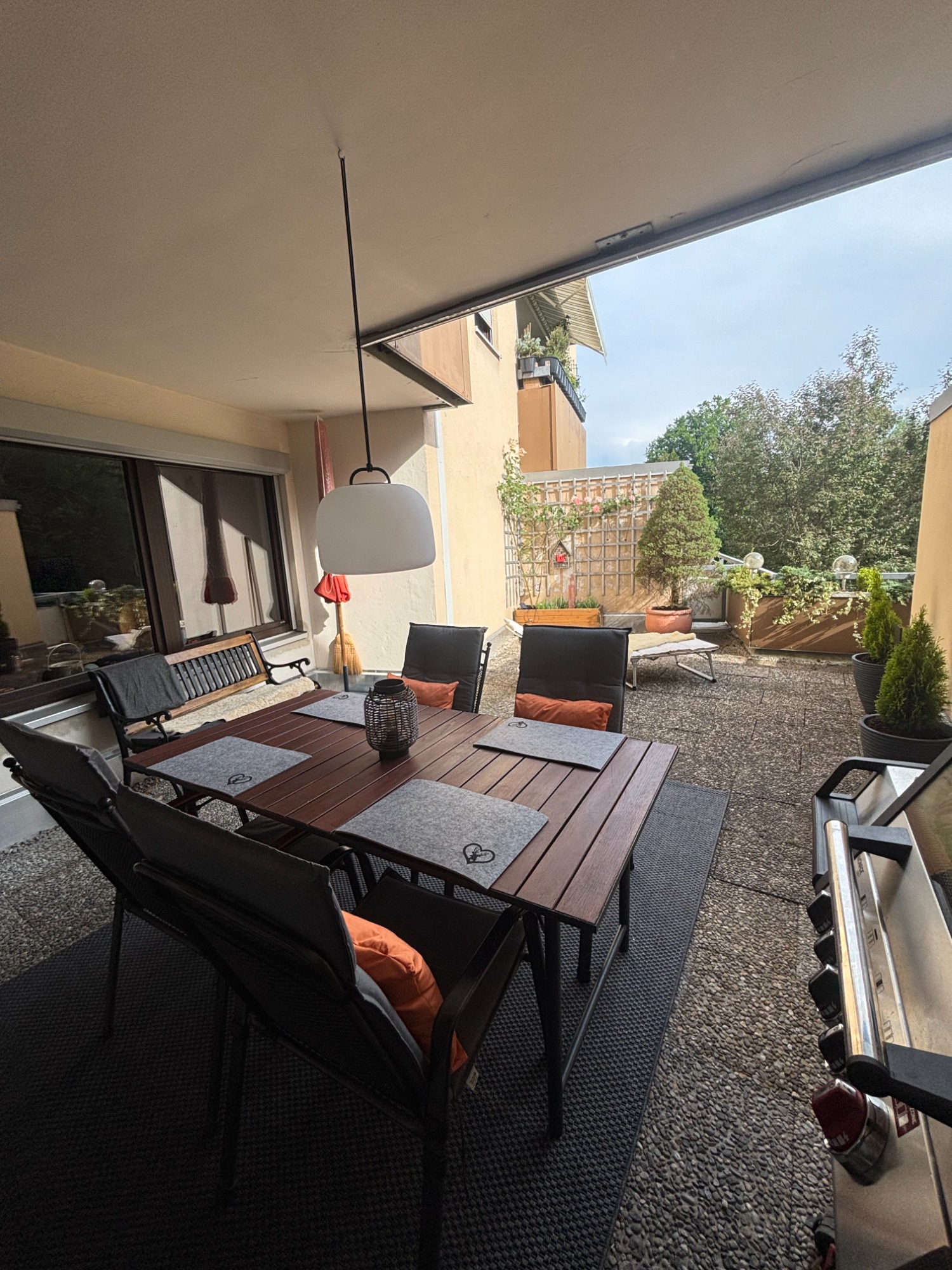 Die große Terrasse lädt zum Verweilen ein. Durch die Überdachung, kann man auch bei etwas regnerischem Wetter draußen sitzen. Hier finden Sie einen großen Tisch, 4 Stühle, eine separate Bank und eine Liege.