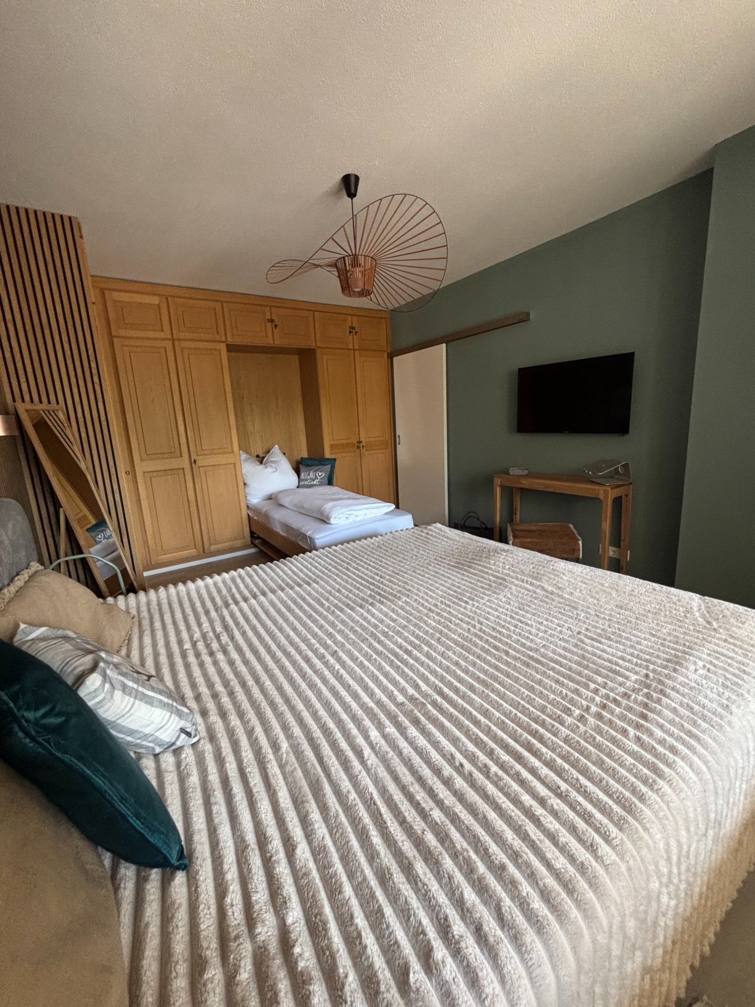 Das großzügige Schlafzimmer ist mit einem Einbauschrank ausgestattet. In diesem Schrank befindet sich ein zusätzliches Schrankbett für eine weitere Person. Das Doppelbett hat eine Größe von 180 x 200 cm. Das Zusatzbett hat eine komfortable Größe von 90 x 200 cm.