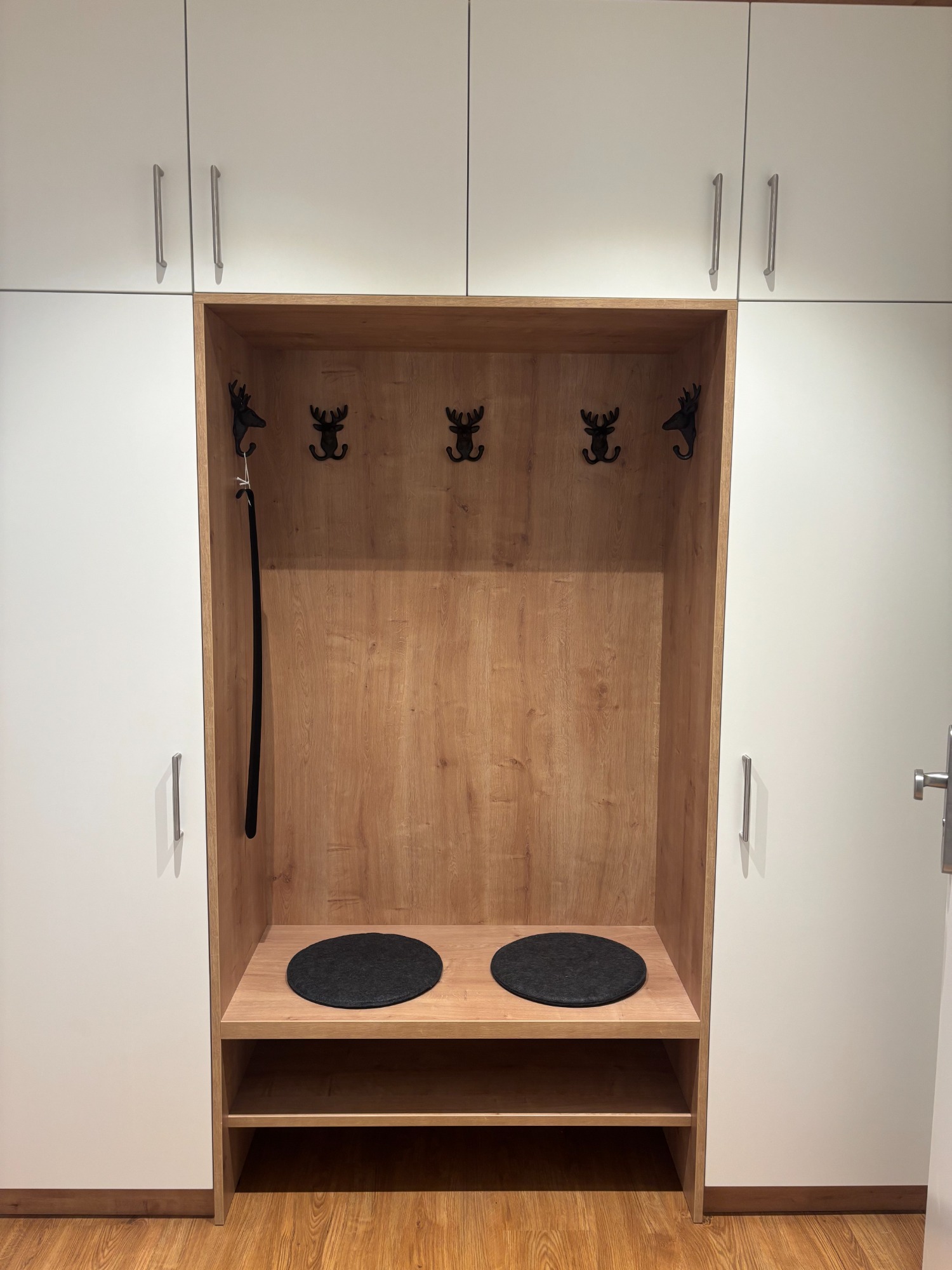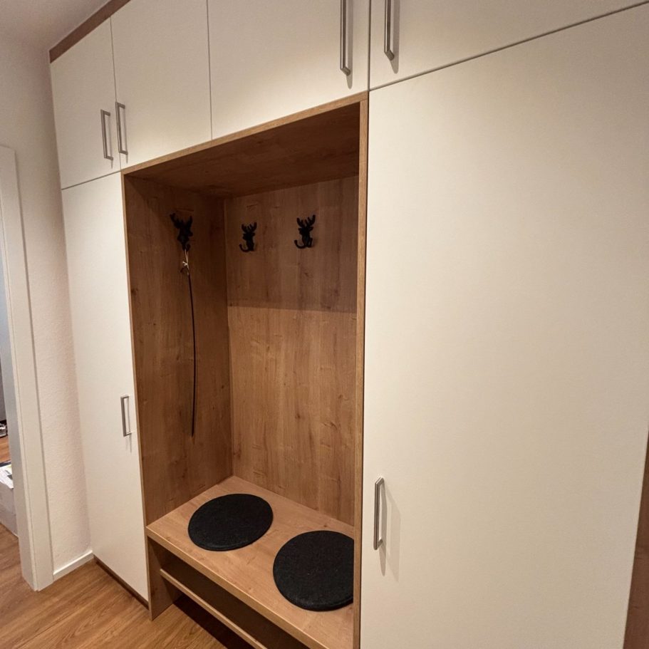 Im Eingangsbereich befindet sich die Garderobe und und der Leinenparkplatz. Hier finden Sie im Schrank auch einen Staubsauger und diverse Reinigungsutensilien